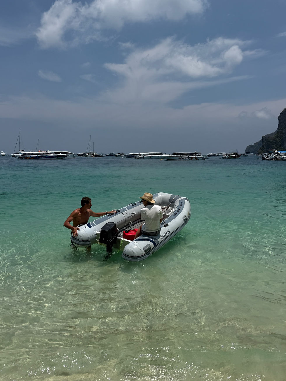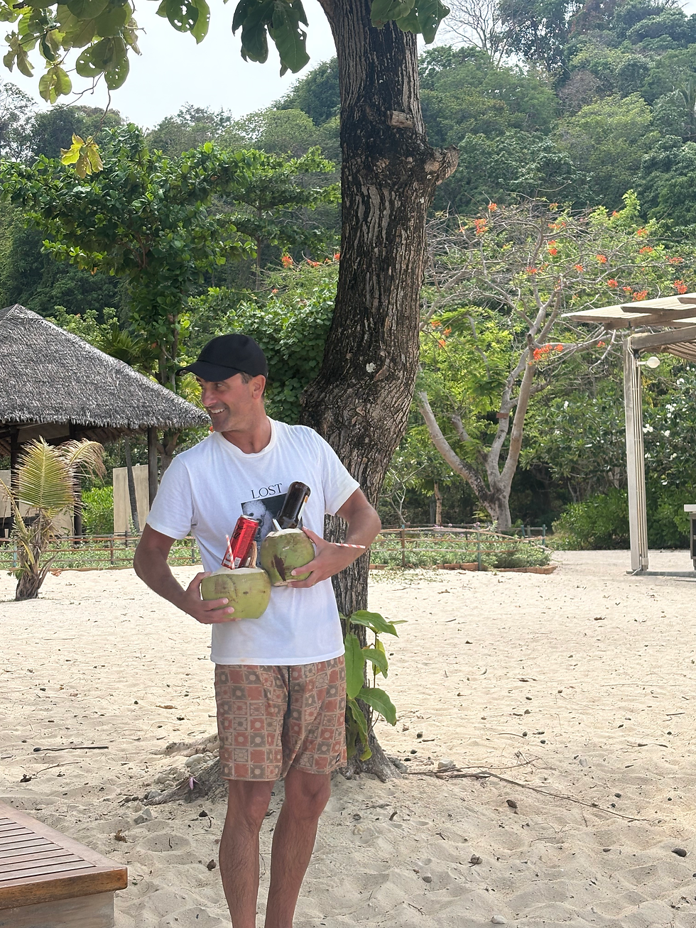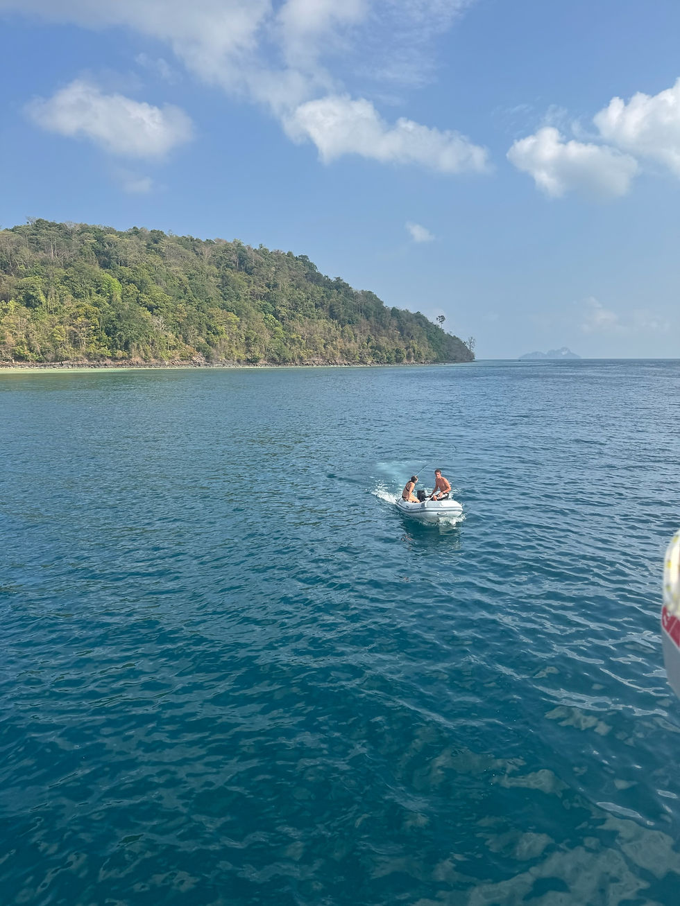 We discovered a few very beautiful spots around Phi Phi. This included checking out the other side of the island and spending two days at Loh Moo Dee Beach. This spot was unreal. We spent 2 days here (sleeping at Phi Phi). At this location we surfed on the back of the dingy, snorkelled and went on land for a coconut from this little beach bar.Â